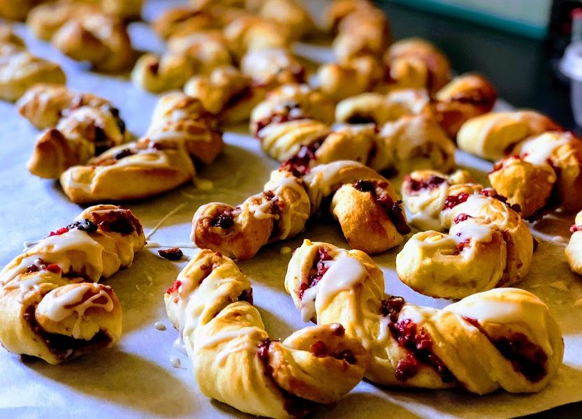 13. Now, the tricky part.  Hold the ends of each strip and twist in opposite directions whilst also shaping it into a cane.  You will want to twist it fairly tight to keep the filling from falling out as it expands. This is where you will have difficulty if you have cut your strips too wide or if they are less than 6 inches long. If things are going sufficiently poorly, I suggest cutting your losses and turning this batch into circular rolls which are still delicious, if less pleasing to the eye. You can then start the second batch fresh with an actual ruler instead of the knuckle method or “eyeballing it” as the case may be.