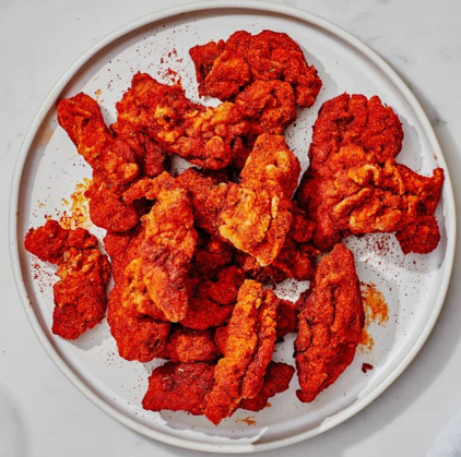- Transfer fried chicken to a large bowl. Generously sprinkle spice mixture over, tossing constantly, until well coated.