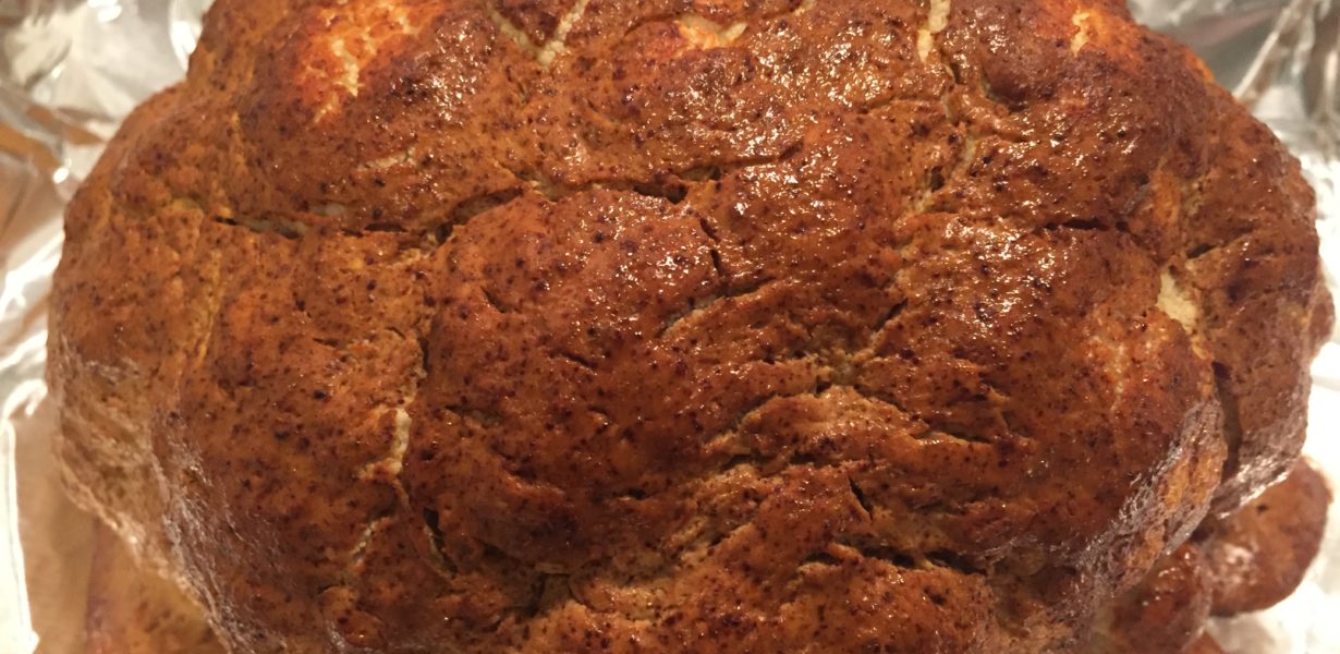 Preheat oven to 400 degree and lightly grease small baking sheet with vegetable oil. Trim base of cauliflower and remove green leaves and woody stem. In a medium bowl, combine yogurt, lime zest and juice, and all seasonings. Dunk cauliflower in the bowl and brush marinade evenly over its surface. Place cauliflower on baking sheet and roast until surface is dry and lightly browned, 30-40 minutes. Marinade will form crust. Use excess marinade on meat fish or vegetables–keep for 3 days.